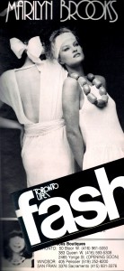 Model Sam Turkis wearing cotton jersey from the Marilyn Brooks fashion collection of the 1980s, as seen in Toronto Life fashion magazine. Listed are the Marilyn Brooks Boutiques that were open, as well as a new one soon to open.