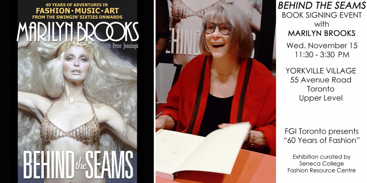 Marilyn Brooks will be at Fashion Group International, Toronto’s exhibition of “60 Years of Fashion” to sign her new book “BEHIND THE SEAMS” on Wed. November 15 from 11:30 to 3:30 PM at Yorkville Village, 55 Avenue Road, Upper Level, Toronto.
